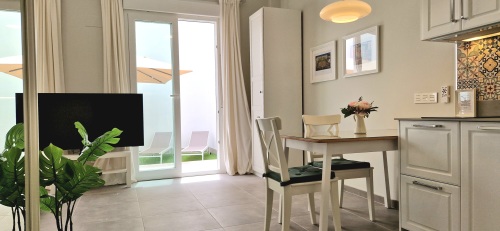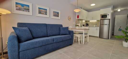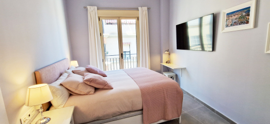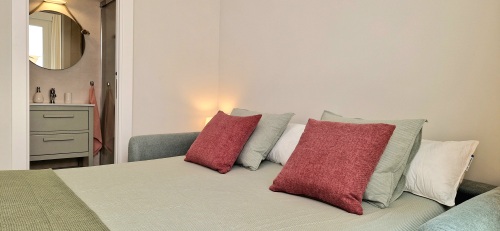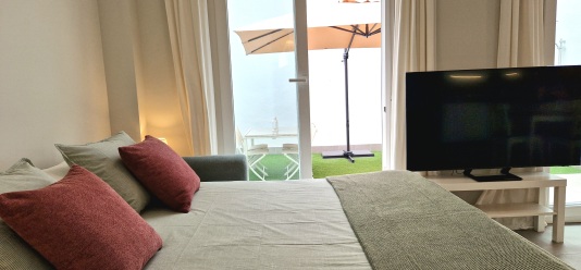 The master bedroom and living room are open plan with a large wardrobe, double bed (160cm x 200cm) with duvet and bed linen. From here you have access to the quiet balcony,