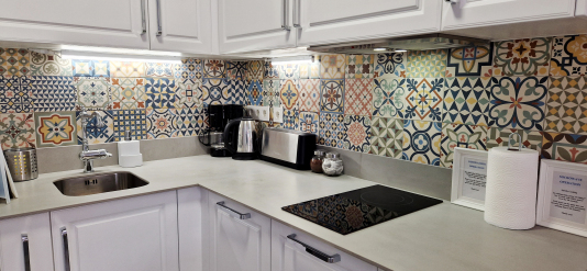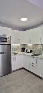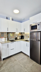 The fully equipped kitchen, not missing a detail, provides all necessary mod cons as ceramic hob, extractor hood, microwave, fridge - freezer, coffee maker, toaster, kettle, blender, juicer, cutlery, plates, glasses, cups, saucepans and of course all those small items that you normally have at home.